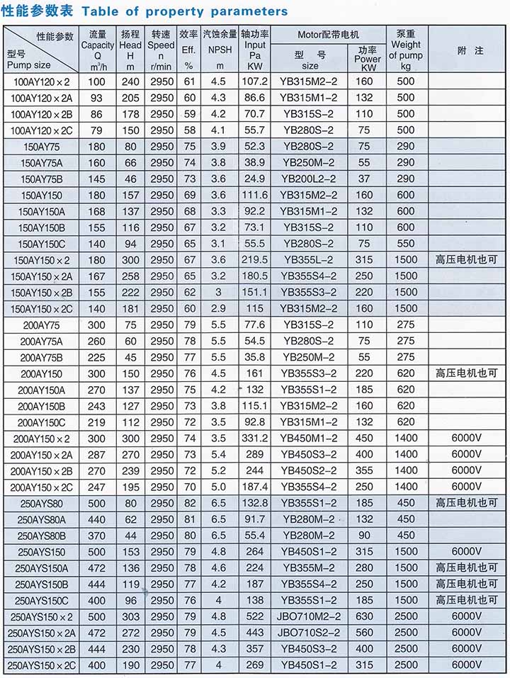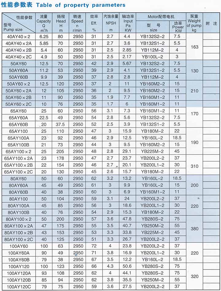 概述: AY型油泵系列,是在老Y型油泵系列的基礎(chǔ)上進(jìn)行改造并重新設(shè)計(jì)的。它是為滿足現(xiàn)代化建設(shè)的需要,盡快地適應(yīng)以節(jié)能為中心的設(shè)備更新?lián)Q代而發(fā)展的新產(chǎn)品,具有下列特點(diǎn)。 1、軸承體部件將原35,50,60軸承體分別用45,55,70軸承體,提高了可靠性。 2、水力過(guò)流部件采用了高效節(jié)能泵的水力模型,平均比老Y型油泵的效率高5-8%。 3、為保持繼承性,AY型油泵的結(jié)構(gòu)型式、安裝尺寸、性能參數(shù)范圍保持與Y型油泵相同,便于老裝置更新改造。 4、零部件通用化程度高,通標(biāo)件為幾個(gè)系列產(chǎn)品共用。 5、選材精煉,主體以Ⅱ、Ⅲ類(lèi)材料為主,軸承體等零件增加為鑄鋼、鑄鐵兩種,為寒冷地區(qū)、露天使用,船用提供了有利條件。 6、軸承有空氣冷、風(fēng)扇冷、水冷三種,根據(jù)泵的不同使用溫度選用。其中風(fēng)扇冷尤為適用于缺水或水質(zhì)差的地區(qū)。