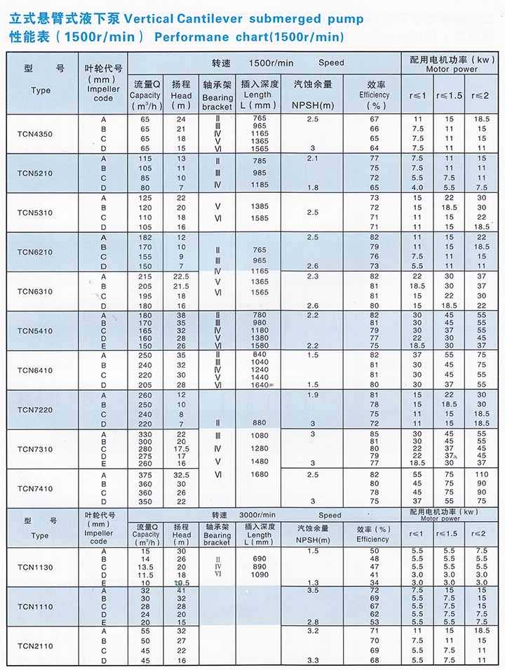 概述: TCN型泵是立式、單級、單吸、懸臂式液下泵,用圓柱管聯(lián)結(jié)泵的水力部件和底座。出液管同圓柱管分開,不用采取軸封措施,泵在液下部位不設(shè)軸承,可以輸送含有固體顆粒的介質(zhì)。根據(jù)介質(zhì)中固體顆粒的大小和性質(zhì)不同,泵葉輪又分為兩種型式,即閉式葉輪(TCN型)加開式葉輪(TCF型)當(dāng)介質(zhì)含顆粒較多而尺寸較大時,選用開式葉輪。泵的插入深度根據(jù)電機(jī)極數(shù),所配用軸承架的規(guī)格大小可以在700~1800mm范圍內(nèi)變化。當(dāng)需要時,泵可以配帶吸入管。 流量Q:5-400m3/h 揚(yáng)程H:2.5-110m 溫度t:-20℃~+200℃ 用途: 化工、石油化工、采礦、造紙業(yè)、水泥廠、煉鋼廠、自來水廠、食品等行業(yè)。 輸送各種無機(jī)酸和有機(jī)酸,各種堿性溶液、磷復(fù)肥裝置的料漿。 水力特性: 可以根據(jù)泵輸送介質(zhì)的性質(zhì)和運(yùn)行條件選擇泵體和葉輪的型式。葉輪可供選擇的型式