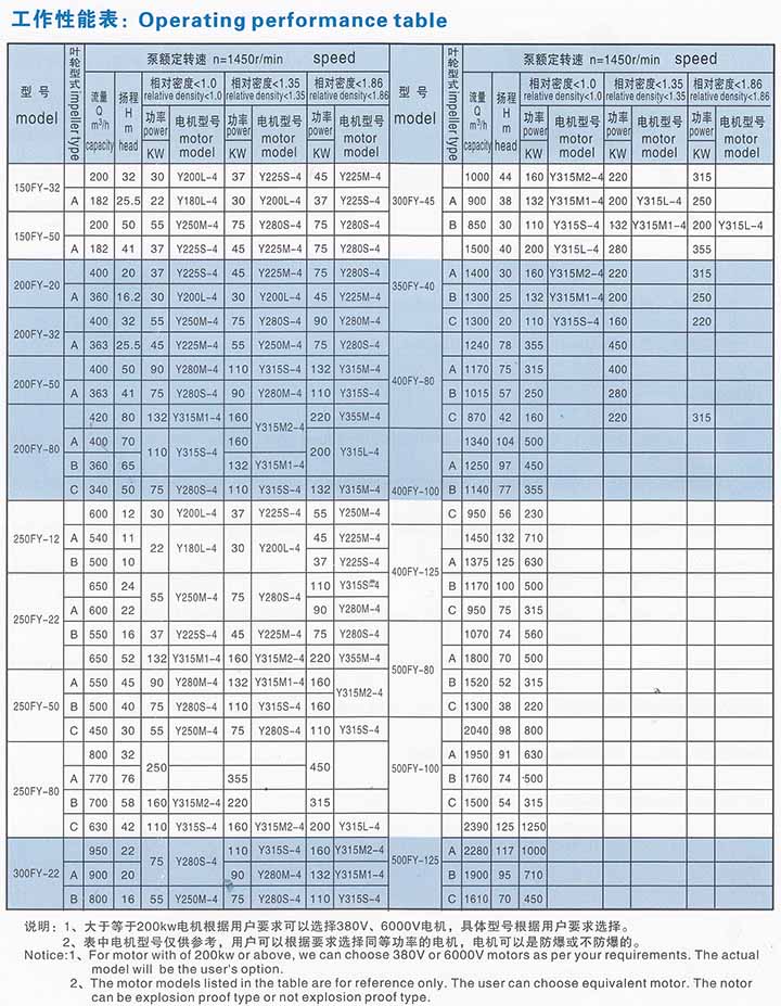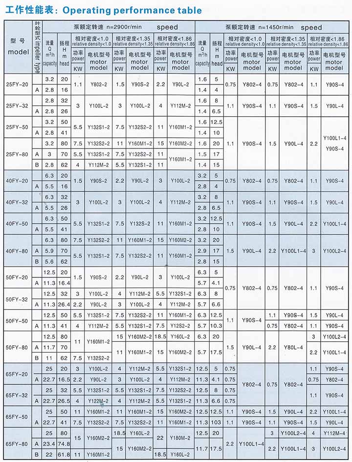 概述: FY、FYS型耐腐蝕泵立式液下泵是-種單級(jí)單吸長(zhǎng)軸式液下離心泵,其標(biāo)記、額定性能點(diǎn)和法蘭連接尺寸等效采用ISO2858國(guó)際標(biāo)準(zhǔn),技術(shù)條件采用IS05199標(biāo)準(zhǔn)。與原FY型耐腐蝕液下泵相比,具有體積小、效率高、節(jié)能效果好,運(yùn)行可靠等優(yōu)點(diǎn)。適用于輸送不含固體顆粒、磨料的腐蝕性介質(zhì)。 泵的輸送溫度-般為0~105℃。溫度在-200~0℃、105~18℃0時(shí)可采用保溫夾套及冷卻夾套,采用低溫或高溫耐磨導(dǎo)軸承,此類情況用戶應(yīng)說(shuō)明。 如輸送介質(zhì)有少量固體顆?;螂s質(zhì)可選用本公司的TCN型懸臂式液下泵,性能穩(wěn)定可靠。 泵的工作壓力按1.6MPa設(shè)計(jì)。 泵的性能范圍:流量為1.6-2600m3/h、揚(yáng)程為5-132m。 根據(jù)所輸送介質(zhì)的不同,F(xiàn)Y型立式液下泵接觸液體部分的材質(zhì)可選用鑄鐵(用符號(hào)H表示)、鑄鋼、1Cr18Ni9Ti(用符號(hào)B表示)、1Cr18Ni12M02Ti(用符號(hào)M表示)、304、304L、316、316L、904、Lewmet合金、20號(hào)合金等材料制造。 FYS型耐腐蝕液下泵適用化工、醫(yī)學(xué)、造幣、染化、冶金、環(huán)保、農(nóng)藥等行業(yè)輸送幾乎所有的化學(xué)介質(zhì)。(除少數(shù)介質(zhì)如溶融金屬鋰、鈉、鉀、三氟化氯等)。