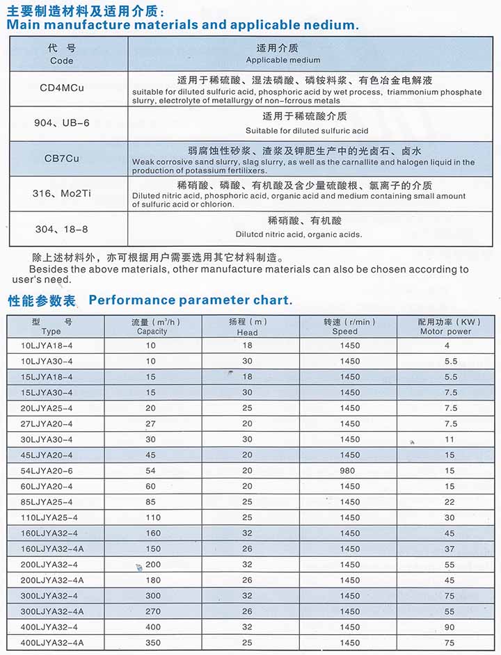 概述: LJYA系列料漿泵為單級單吸立式懸臂式離心液下泵。葉輪為半開式,葉輪前后均配有耐磨蓋,廣泛應用于化工流程輸送含30%以下固體顆粒,粘度低于200CP的磨、腐蝕交互作用的介質。特別適用于磷肥工業(yè)中輸送磷酸、磷銨料漿等介質。 輸送介質-般低于110℃。如需輸送更高溫度的介質,應考慮用冷卻水冷卻軸承。 性能范圍:流量Q=1O~400m3/h 揚程H=50m